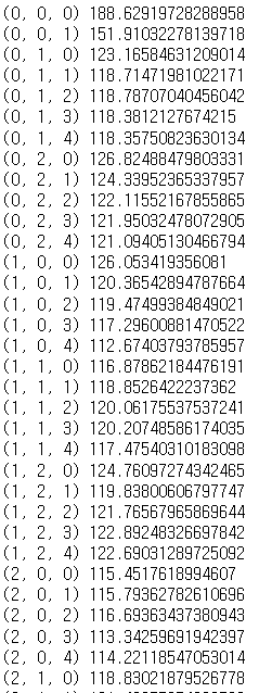 우선 첫번째 방법은 가능한 모든 (p,d,q)값을 돌려보고 가장 높은 정확도를 주는 쌍을 고르는 것이다. for문을 통해서 p,d,q 가 각각 0부터 4까지의 값일 때 AIC (Akaike information criterion) 가 얼마정도 되는지 프린트 한다. 프린트된 결과를 보고, 가장 낮은 값을 가진 p,d,q 쌍을 고르면 된다.
